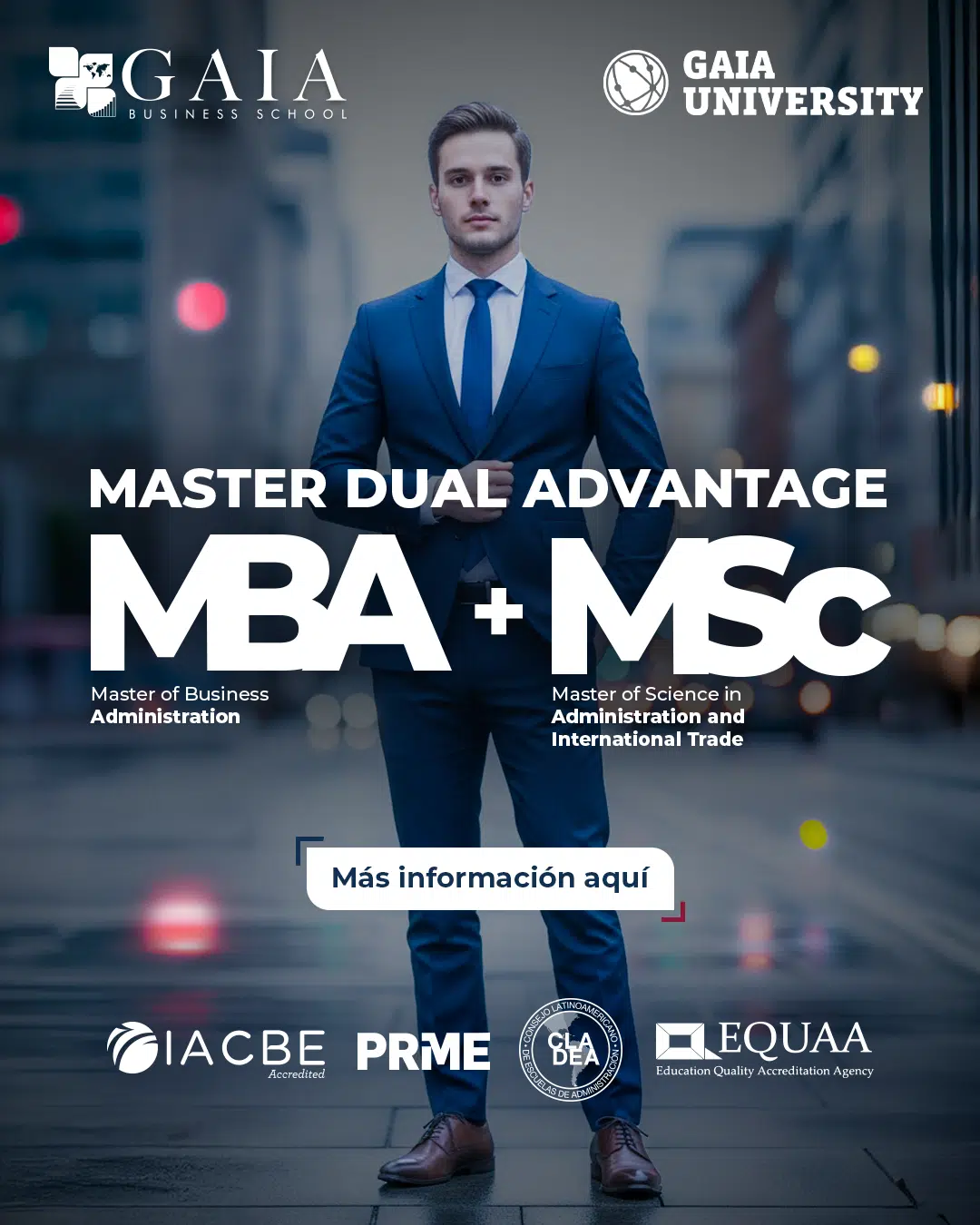 A través de nuestra alianza estratégica con GAIA University, presentamos el Master Dual Advantage Program, una ruta académica diseñada para que obtengas simultáneamente tu MBA y una Maestría Administración y Comercio Internacional.
